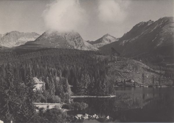 Widok Szczyrbskiego Jeziora z odbijaj±cymi się wodzie szczytami. Nad stawem po prawej stronie willa Maryna. Dalej las i skocznia narciarska pod Skrajnym Soliskiem. W tle szczyty: Ostra , Skrajne Solisko, Szczyrbski Szczyt i Baszty ze Skrajn± Baszt±.