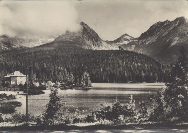 Widok na Szczyrbskie Jezioro. W tle Dolina Furkotna, Wielkie Solisko, Szczyrbski Szczyt, Szatan i Skrajna Baszta. Nad jeziorem w¶ród drzew widoczna willa Marina.