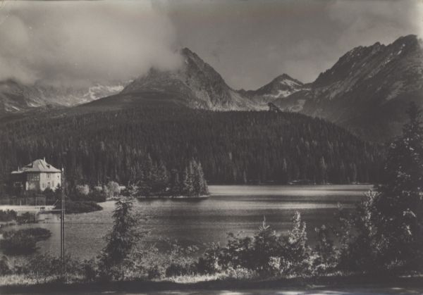 Widok na Szczyrbskie Jezioro. W tle Dolina Furkotna, Wielkie Solisko, Szczyrbski Szczyt, Szatan i Skrajna Baszta. Nad jeziorem w¶ród drzew widoczna willa Marina.