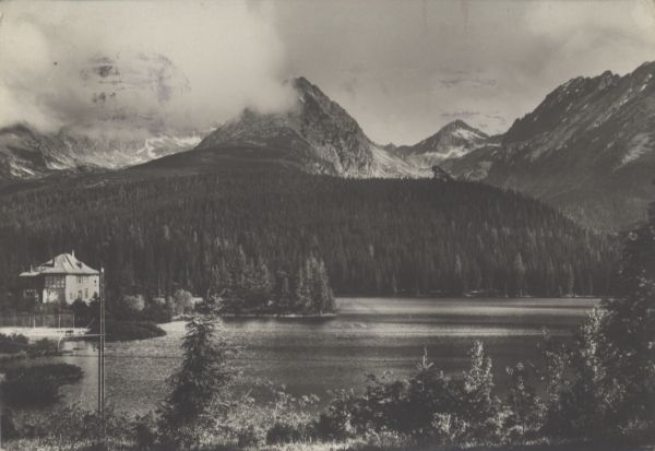 Widok na Szczyrbskie Jezioro. W tle Dolina Furkotna, Wielkie Solisko, Szczyrbski Szczyt, Szatan i Skrajna Baszta. Nad jeziorem w¶ród drzew widoczna willa Marina.