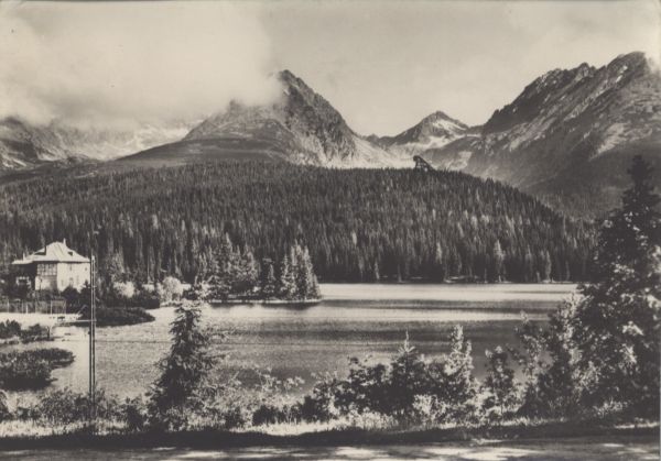 Widok na Szczyrbskie Jezioro. W tle Dolina Furkotna, Wielkie Solisko, Szczyrbski Szczyt, Szatan i Skrajna Baszta. Nad jeziorem w¶ród drzew widoczna willa Marina.