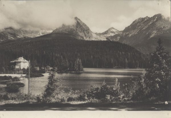 Widok na Szczyrbskie Jezioro. W tle Dolina Furkotna, Wielkie Solisko, Szczyrbski Szczyt, Szatan i Skrajna Baszta. Nad jeziorem w¶ród drzew widoczna willa Marina.