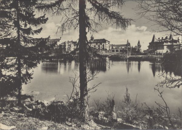 Szczyrbskie Jezioro. Nad brzegiem budynki sanatoryjno - hotelowe. Na pierwszym planie drzewa.