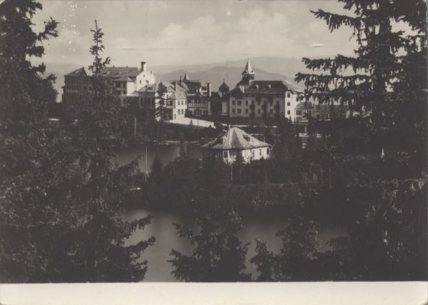 Widok na Szczyrbskie Jezioro. Nad brzegiem jeziora widoczne budynki sanatoryjne i hotelowe. Na pierwszym planie drzewa.