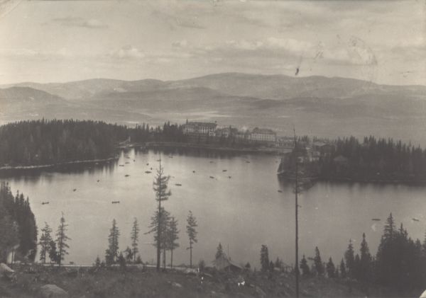 Widok na Szczyrbskie Jezioro otoczone lasem i zabudowania hotelowo - sanatoryjne na jego brzegu. W tle Kotlina Liptowska i Niżne Tatry.