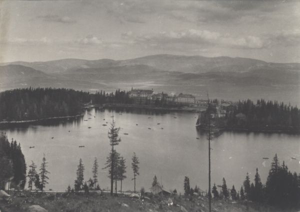 Widok na Szczyrbskie Jezioro otoczone lasem i zabudowania sanatoryjno - hotelowe na jego brzegu. W tle Kotlina Liptowska i Niżne Tatry.