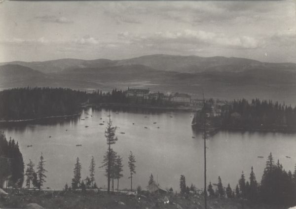 Widok na Szczyrbskie Jezioro otoczone lasem i zabudowania hotelowo sanatoryjne na jego brzegu. W tle Kotlina Liptowska i Niżne Tatry.