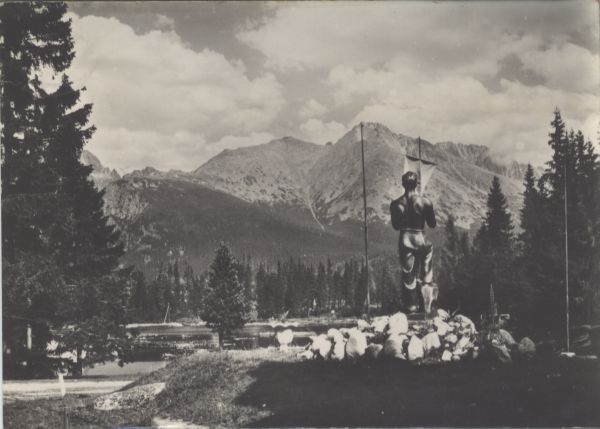 Nowe Szczyrbskie Jezioro. Pomnik poszukiwacza kruszców (górnika) spoglądającego na szczyty Tępej i Kończystej.