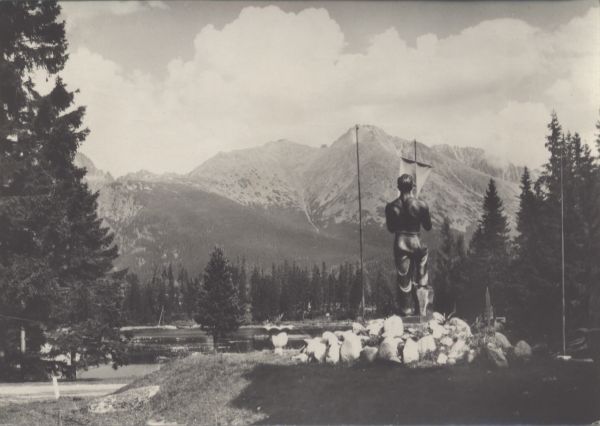 Nowe Szczyrbskie Jezioro. Pomnik poszukiwacza kruszców (górnika) spoglądającego na szczyty Tępej i Kończystej.
