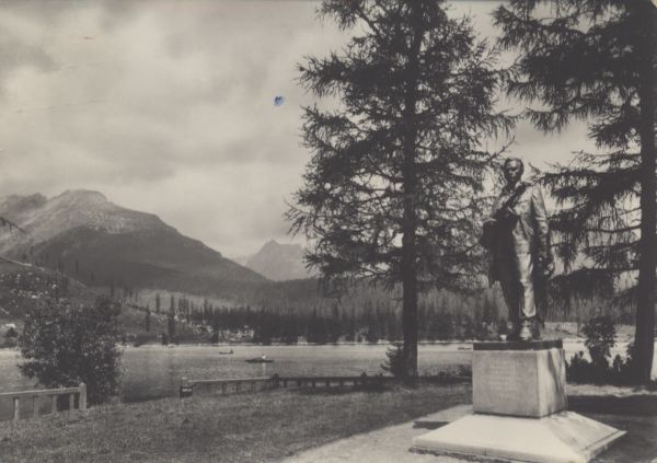 W tle Szczyrbskie Jezioro. Na pierwszym planie skwer i pomnik partyzanta upamiętniający Słowacki Powstanie Narodowe, autorstwa rzeźbiarza Ladislav Snopka.