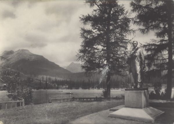 W tle Szczyrbskie Jezioro. Na pierwszym planie skwer i pomnik partyzanta upamiętniaj±cy Słowacki Powstanie Narodowe, autorstwa rzeĽbiarza Ladislav Snopka.