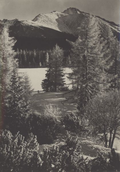 Motyw zimowy znad Szczyrbskiego Jeziora. Las, zamarznięte jezioro, w tle Tępa i Kończysta.
