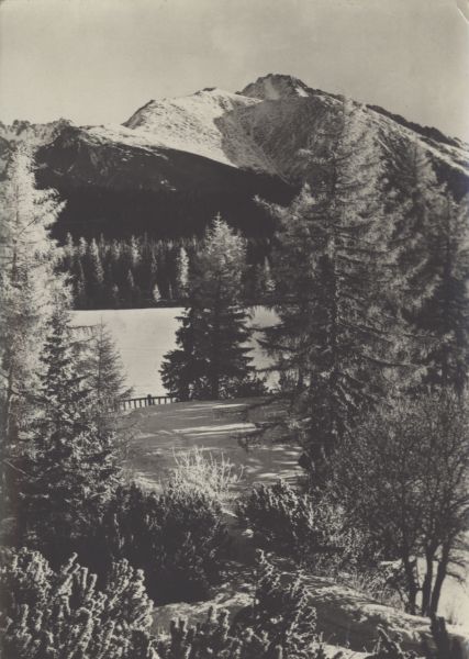 Motyw zimowy znad Szczyrbskiego Jeziora. Las, zamarznięte jezioro, w tle Tępa i Kończysta.