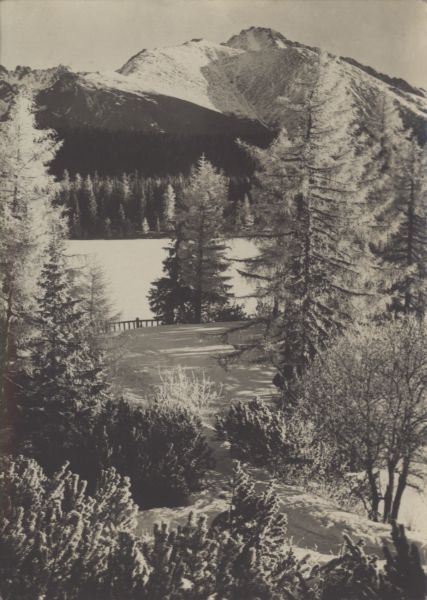 Motyw zimowy znad Szczyrbskiego Jeziora. Las, zamarznięte jezioro, w tle Tępa i Kończysta.