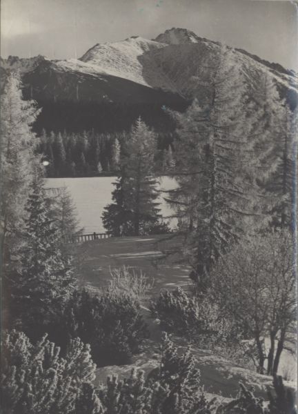 Widok na Szczyrbskie Jezioro. Las, zamarznięte jezioro. Na pierwszym planie ośnieżone drzewa. W tle Tępa i Kończysta.