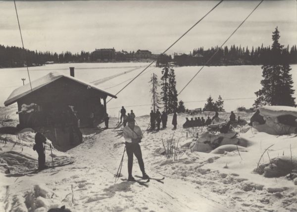 Dolna stacja wyciągu narciarskiego na Skrajne Solisko, przy niej narciarze i turyści. Na pierwszym planie narciarz na wyciągu. Z tyłu zamarznięte Szczyrbskie Jezioro. W tle las i zabudowania hotelowe.