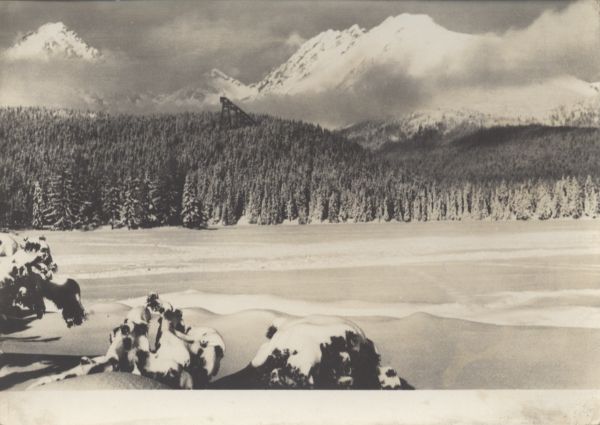 Zamarznięte Szczyrbskie Jezioro. W centralnej czę¶ci stara skocznia narciarska. W tle Solisko, Szczyrbski Szczyt i Skrajna Baszta.