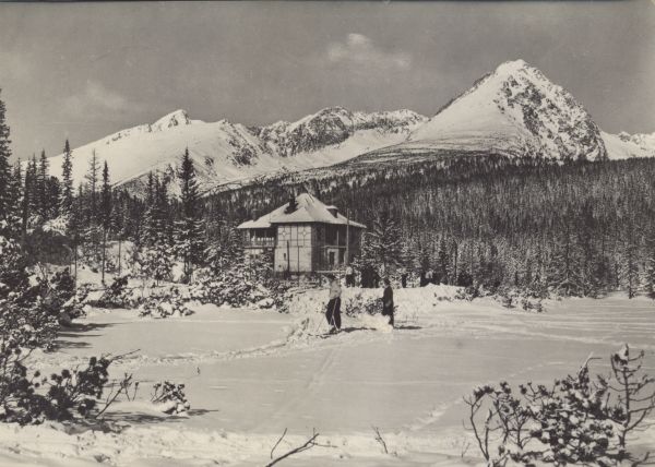 Zimowy widok na willę Marina nad Szczyrbskim Jeziorem. W tle las i ośnieżone szczyty: Krywań, Siodełkowa Kopa, Ostra i Solisko. Na pierwszym planie dwóch narciarzy.