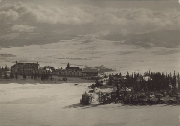 Zimowy widok na skute lodem Szczyrbskie Jezioro i zabudowania hotelowo sanatoryjne na jego brzegu. W tle Kotlina Liptowska i Niżne Tatry.