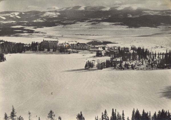 Zimowy widok na skute lodem Szczyrbskie Jezioro otoczone lasem i zabudowania hotelowo sanatoryjne na jego brzegu. W tle Kotlina Liptowska i Niżne Tatry.
