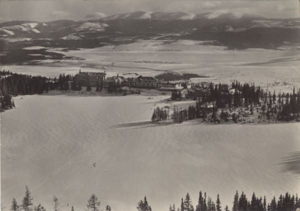 Zimowy widok na skute lodem Szczyrbskie Jezioro otoczone lasem i zabudowania hotelowo sanatoryjne na jego brzegu. W tle Kotlina Liptowska i Niżne Tatry.