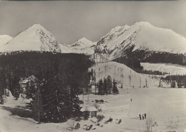 Zimowy widok na Szczyrbskie Jezioro, zabudowania i skocznię narciarsk±. Na pierwszym planie widoczni narciarze. W tle: Szczyrbskie Solisko, Szczyrbski Szczyt, Szatan i Skrajna Baszta.