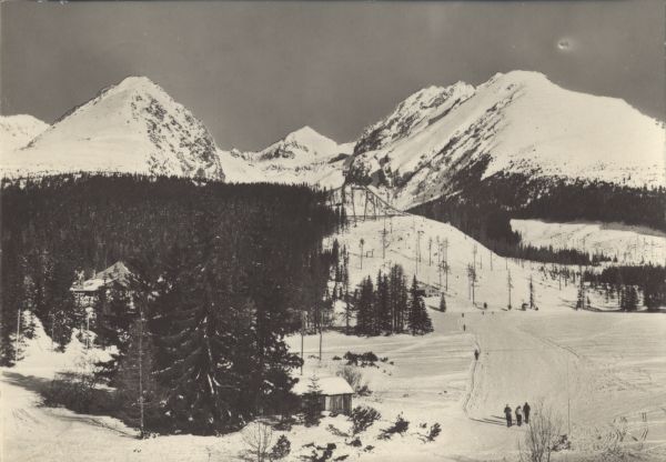 Zimowy widok na Szczyrbskie Jezioro, zabudowania i skoczniê narciarsk±. Na pierwszym planie widoczni narciarze. W tle: Szczyrbskie Solisko, Szczyrbski Szczyt, Szatan i Skrajna Baszta.