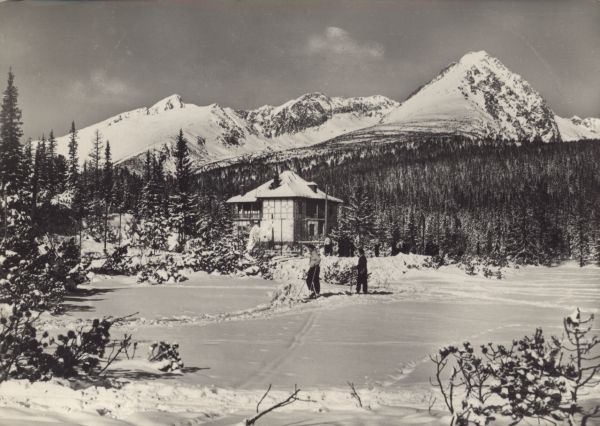 Zimowy widok na willę Marina nad Szczyrbskim Jeziorem. W tle las i ośnieżone szczyty: Krywań, Siodełkowa Kopa, Ostra i Solisko. Na pierwszym planie dwóch narciarzy.