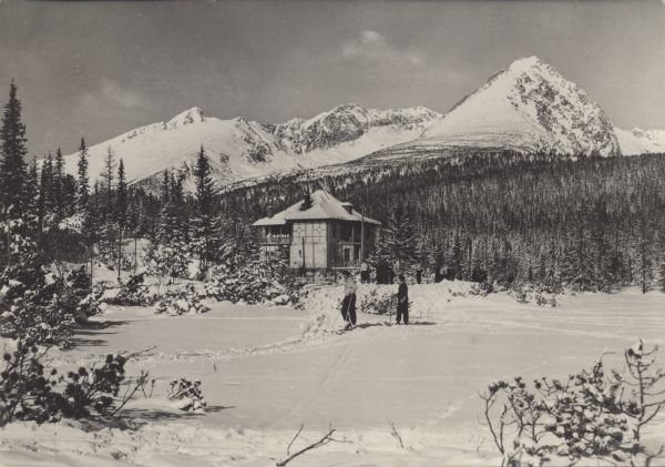 Zimowy widok na willę Marina nad Szczyrbskim Jeziorem. W tle las i ośnieżone szczyty: Krywań, Siodełkowa Kopa, Ostra i Solisko. Na pierwszym planie dwóch narciarzy.