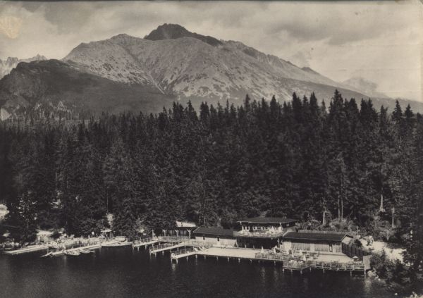 Szczyrbskie Jezioro. Widok na kąpielisko i przystań dla łodzi otoczone lasem. W tle Tępa i Kończysta.