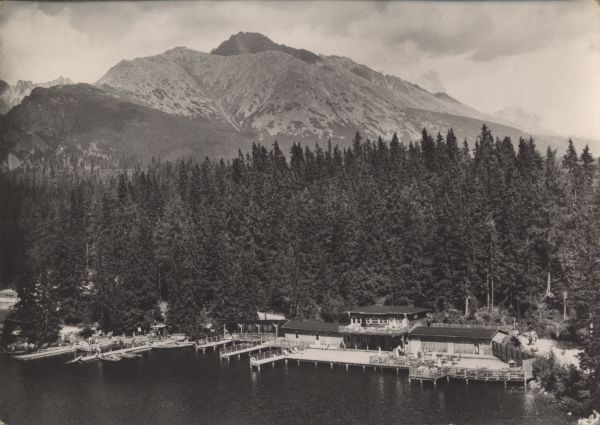 Szczyrbskie Jezioro. Widok na kąpielisko i przystań dla łodzi otoczone lasem. W tle Tępa i Kończysta.