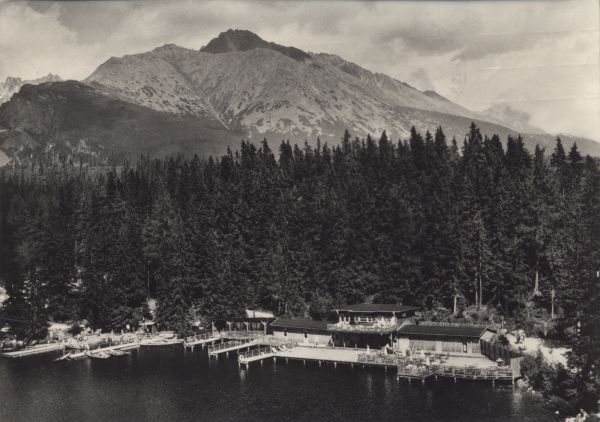 Szczyrbskie Jezioro. Widok na kąpielisko i przystań dla łodzi otoczone lasem. W tle Tępa i Kończysta.