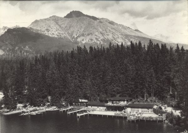 Szczyrbskie Jezioro. Widok na kąpielisko i przystań dla łodzi otoczone lasem. W tle Tępa i Kończysta.