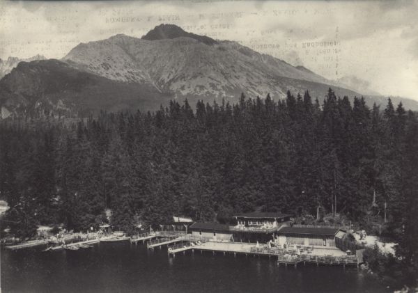 VYSOKÉ TATRY Štrbské pleso (1350 m) Kúpalisko, v pozadí Tupá (2284 m) a Končistá (2534 m)