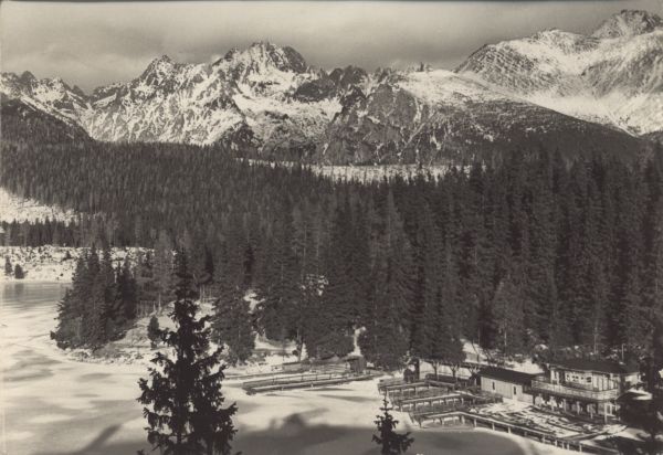Zimowy widok na zamarznięte Szczyrbskie Jezioro. W tle Kopa Popradzka, Wysoka, Osterwa, Tępa. W prawym dolnym rogu zabudowania kąpieliska.