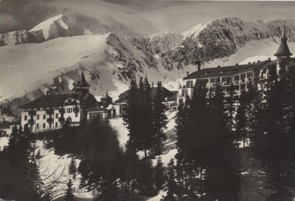 Zimowy widok na zabudowania hotelowe w miejscowości Szczyrbskie Jezioro. W tle od lewej widać Krywań, Siodełkową Kopę i grań Ostrej.