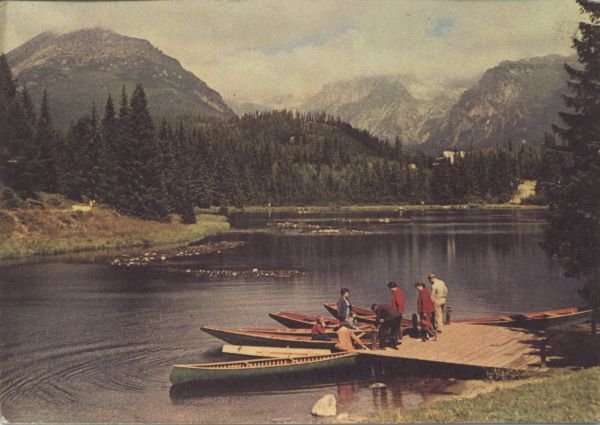 Widok na Nowe Szczyrbskie Jezioro. W tle Wysoka, z lewej Skrajna Baszta z prawej Kończysta. Z prawej strony u dołu mała przystań z łódkami i stojącymi na przystani i w łodziach ludźmi. Dookoła jeziora las.