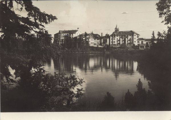 Widok na jezioro i zabudowania sanatoryjno hotelowe w Szczyrbskim Jeziorze.