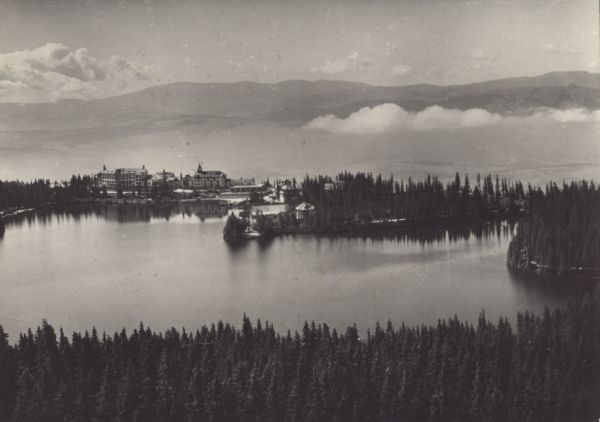 Widok na Szczyrbskie Jezioro otoczone lasem i zabudowania hotelowo sanatoryjne na jego brzegu. W tle Kotlina Liptowska i Niżne Tatry.