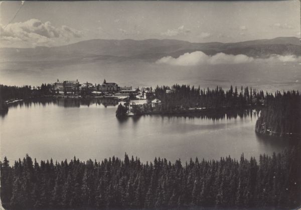 Widok na Szczyrbskie Jezioro otoczone lasem i zabudowania hotelowo sanatoryjne na jego brzegu. W tle Kotlina Liptowska i Niżne Tatry.