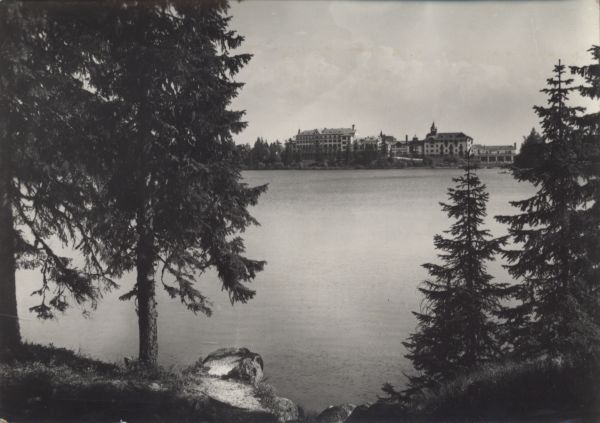 Widok na Szczyrbskie Jezioro. Nad brzegiem jeziora widoczne budynki sanatoryjne i hotelowe. Na pierwszym planie drzewa.