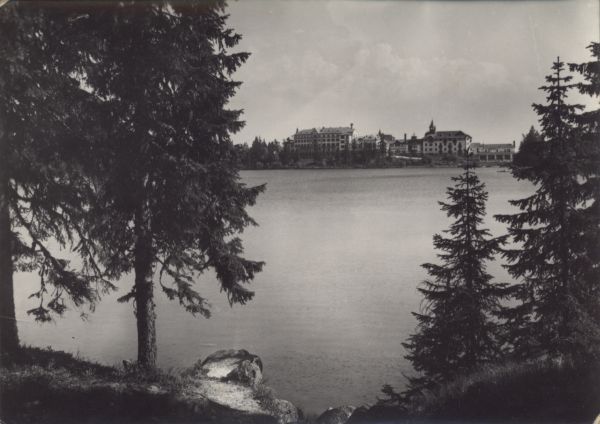 Widok na Szczyrbskie Jezioro. Nad brzegiem jeziora widoczne budynki sanatoryjne i hotelowe. Na pierwszym planie drzewa.