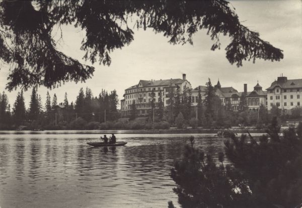 Widok na Szczyrbskie Jezioro i pływające po nim łódki. Na brzegu jeziora budynki sanatoryjne Hviezdoslav i Krywań wśród drzew. Na pierwszym planie gałęzie.