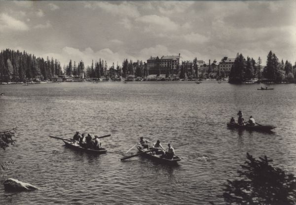 Widok na Szczyrbskie Jezioro, po którym pływają łodzie. W dali na brzegu jeziora las i budynki sanatoryjne Hviezdoslav i Krywań.