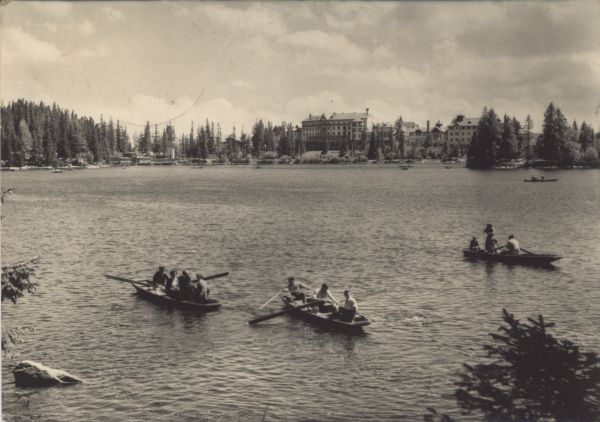 Widok na Szczyrbskie Jezioro, po którym pływaj± łodzie. W dali na brzegu jeziora las i budynki sanatoryjne Hviezdoslav i Krywań.