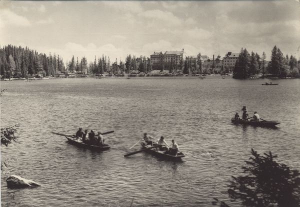 Widok na Szczyrbskie Jezioro, po którym pływaj± łodzie. W dali na brzegu jeziora las i budynki sanatoryjne Hviezdoslav i Krywań.