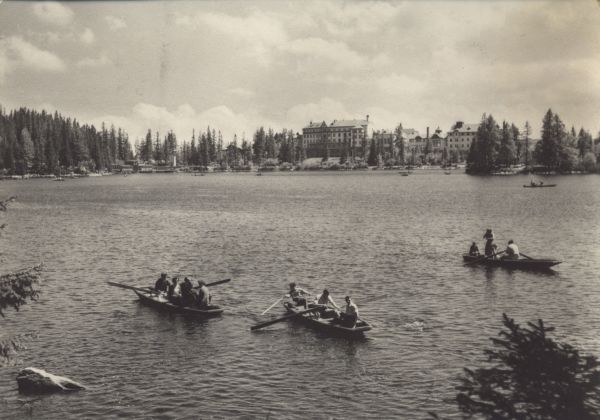 Widok na Szczyrbskie Jezioro, po którym pływają łodzie. W dali na brzegu jeziora las i budynki sanatoryjne Hviezdoslav i Krywań.