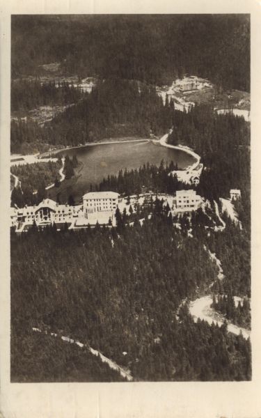 Widok na Nowe Szczyrbskie Jezioro i jego otoczenie. Wśród drzew widoczne budynki domu wypoczynkowego Centrali Związkowych Domów Wypoczynkowych - Zdrowe Pokolenie.