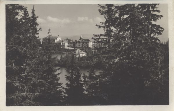 Poprzez drzewa widok na Szczyrbskie Jezioro. Przy jeziorze zabudowania sanatoryjne.