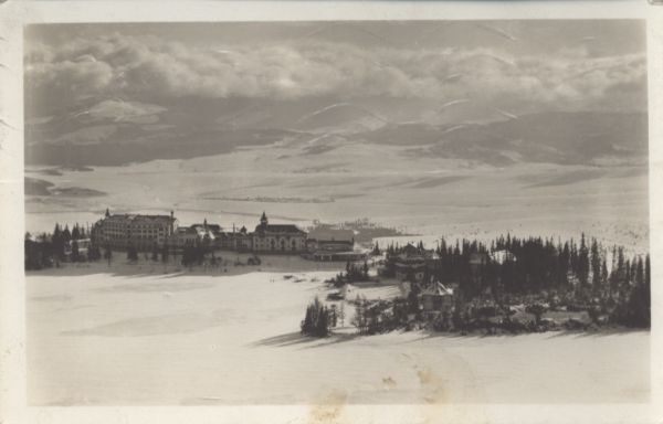 Zimowy widok na skute lodem Szczyrbskie Jezioro i zabudowania hotelowo sanatoryjne na jego brzegu. W tle Kotlina Liptowska i Niżne Tatry.